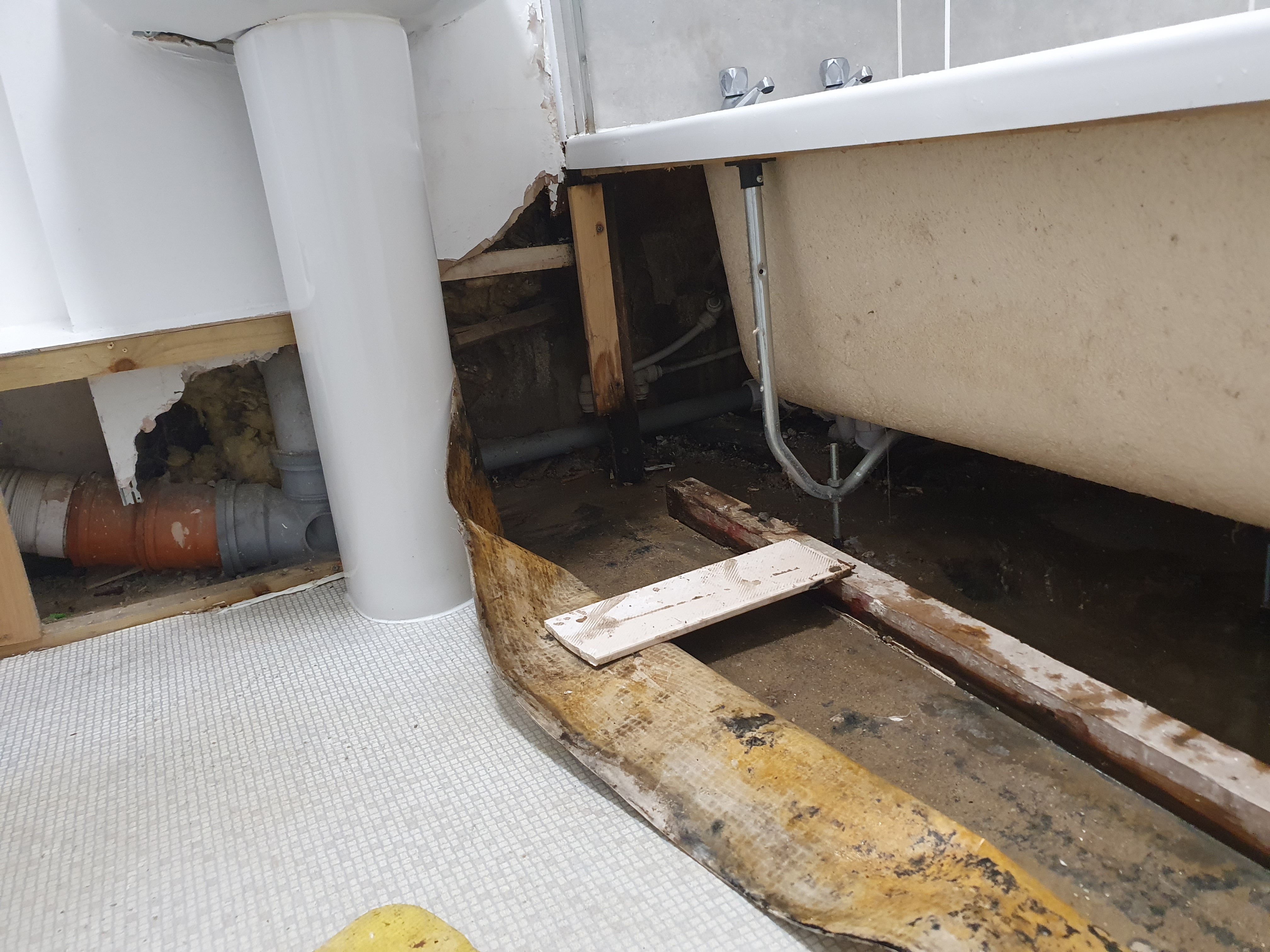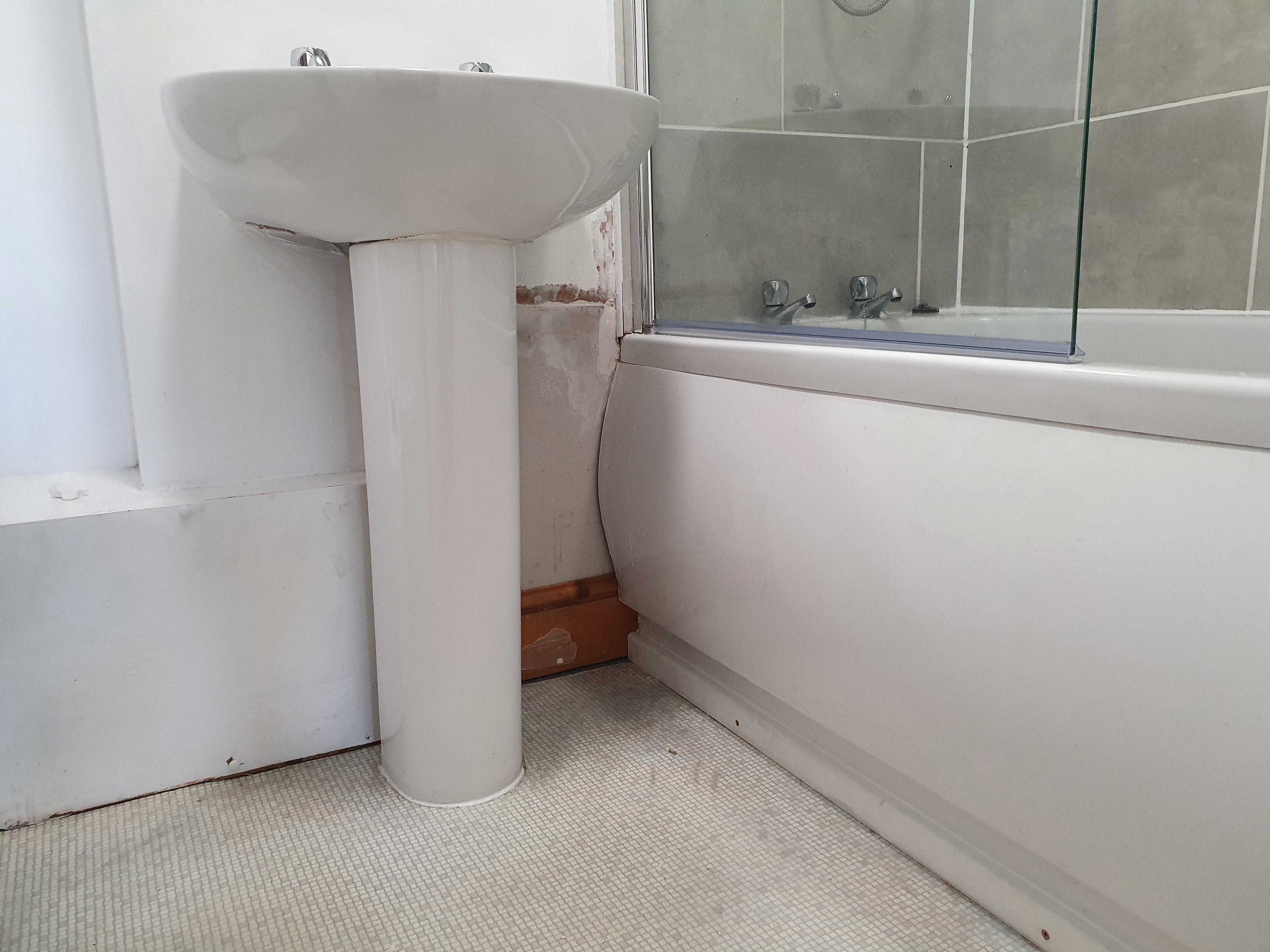 So, time to get to work. I have removed the damaged plaster and skirting and pulled back the flooring to allow to dry. I have also removed the shower screen as this is where the water is getting through. The shower screen needs a new seal and lowering a bit as the gap between the screen on the bath is too big.